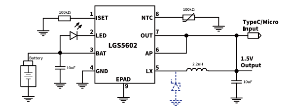 LGS5600是一款专为“锂转干”设计的高度集成、充放电、DFN2*2封装、电源管理芯片,其具备以下核心优势: